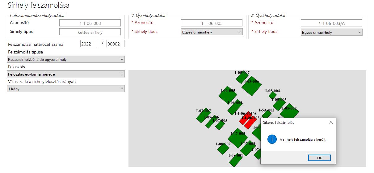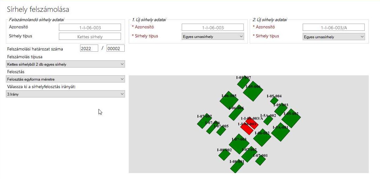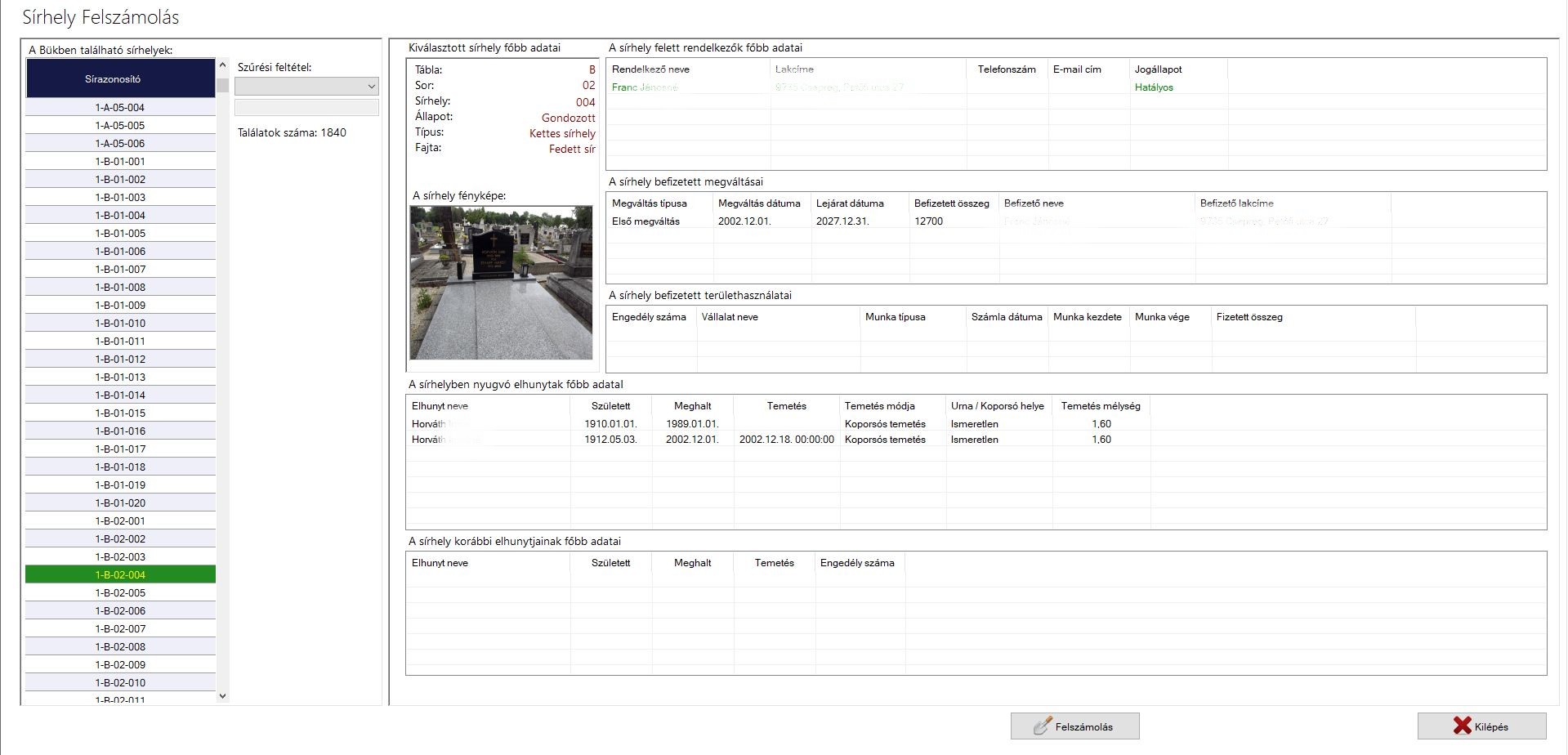 Kiválasztás után a program automatikusan megadja a a sírok azonosító adatait.