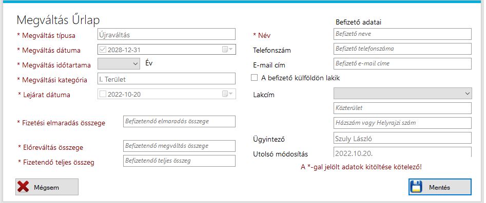 Ürlapok/Nyomtatványok Temetési hely megváltása/újraváltás Ebben a menüpontban kezelheti a sírhely megváltásokat NAGYON FONTOS! A program addíg nem engedi a mentést, amíg minden csillaggal illetve pirossal megjelölt mező nincs kitöltve.