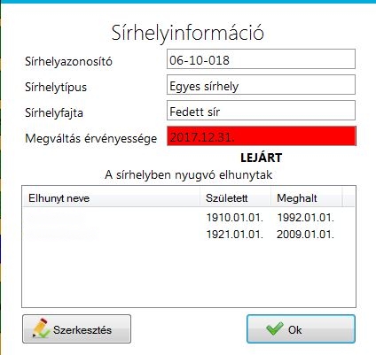 feljön egy ablak az aktuális sírhelyre vonatkozó alap adatokkal