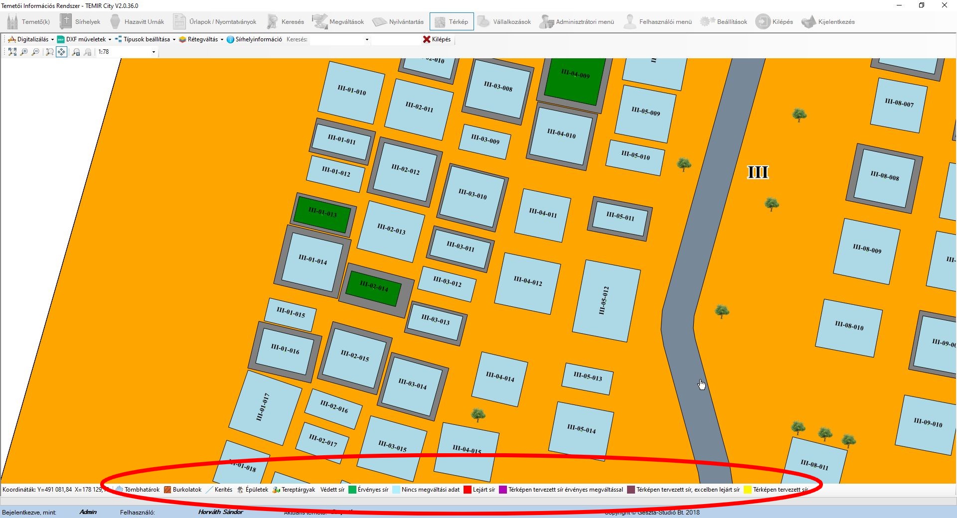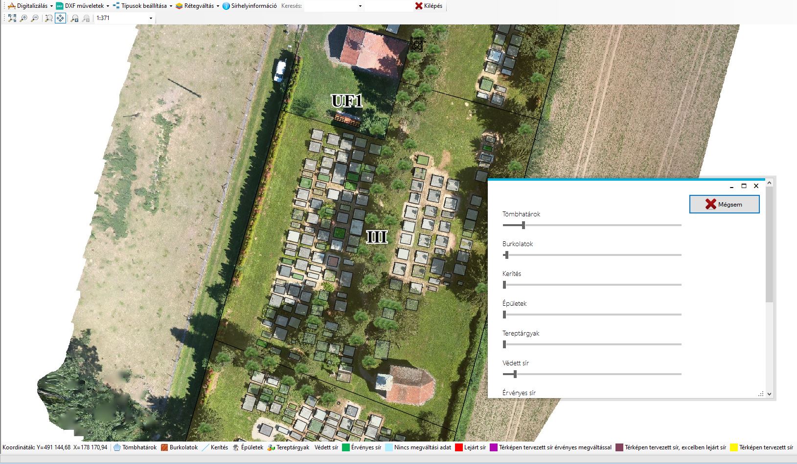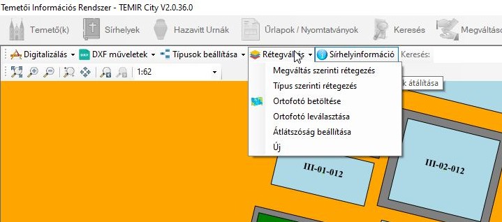 A térkép betöltéskor alapból a MEGVÁLTÁS SZERINTI RÉTEGEZÉS töltődik be, azonban Önnek lehetősége van átváltani a TÍPUS SZERINTI RÉTEGEZÉSre, továbbá amennyiben igényli betöltheti az aktuális temető ORTOFOTO (drónos légi fénykép) térképét is, de ezt kérje meg külön tőlünk az info@temir.hu mailen.