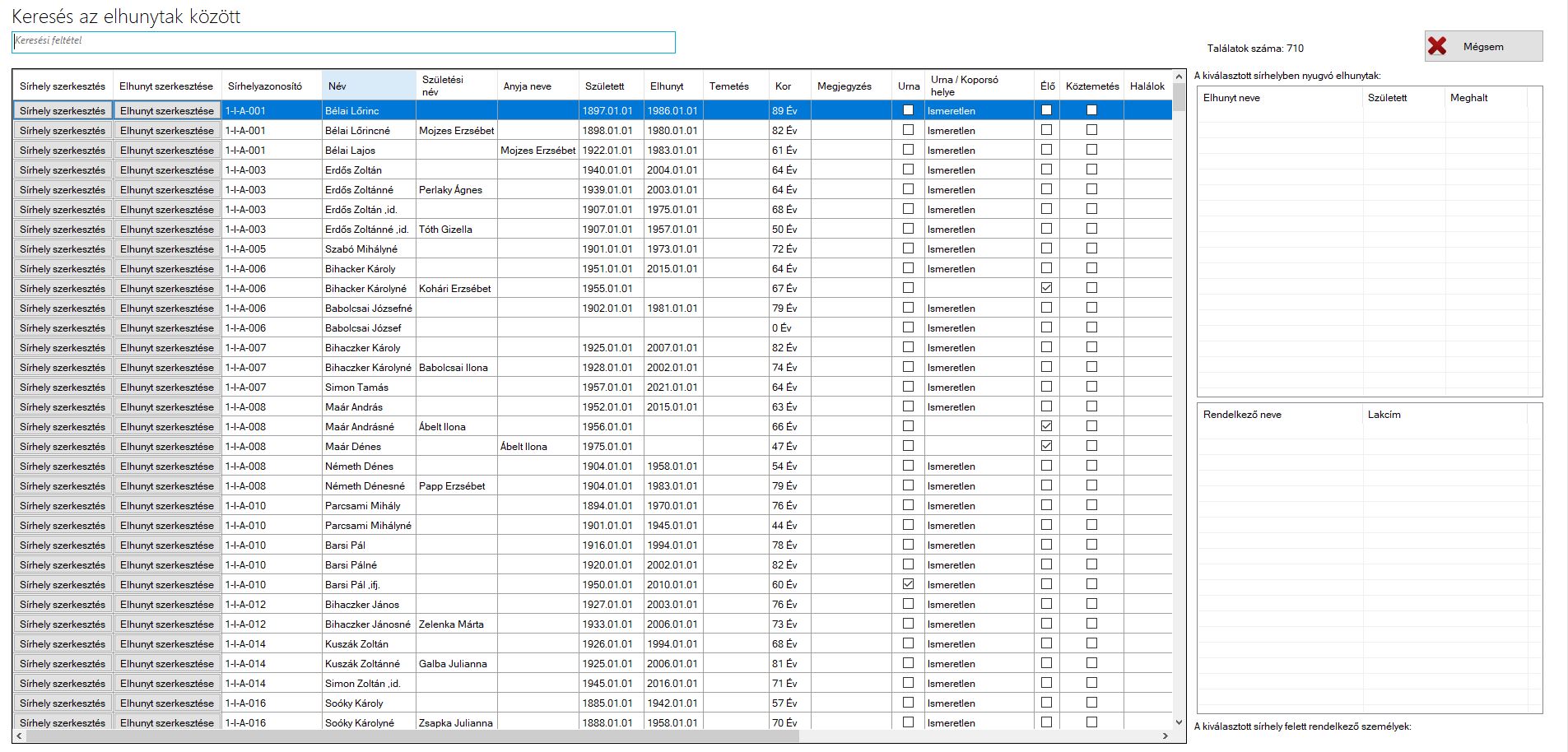 Kezdje el begépelni a keresett adatot. (lehet az elhunyt név, leánykori név, rendelkező vagy évszám) A program közben betölti a találatokat. Amint megtalálta a keresett adatot közvetlenül szerkesztheti a sírhelyet vagy az elhunytat, attól függően, hogy a BAL oldalon melyik gombra kattint.