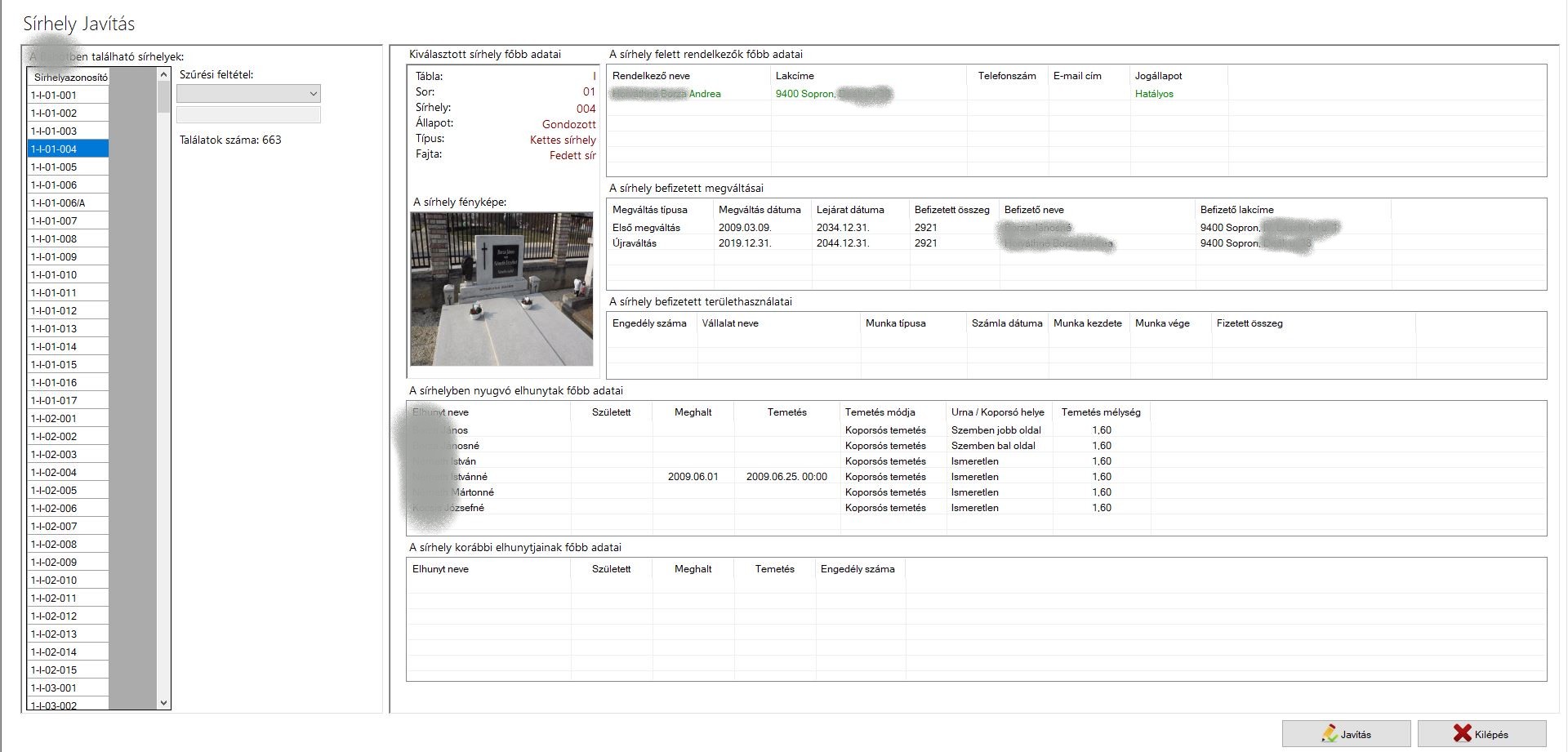 Amint megtalálta a javítandó sírhelyet kattintson a bal oldalon a sírszámra, majd a "Javítás" gombra.