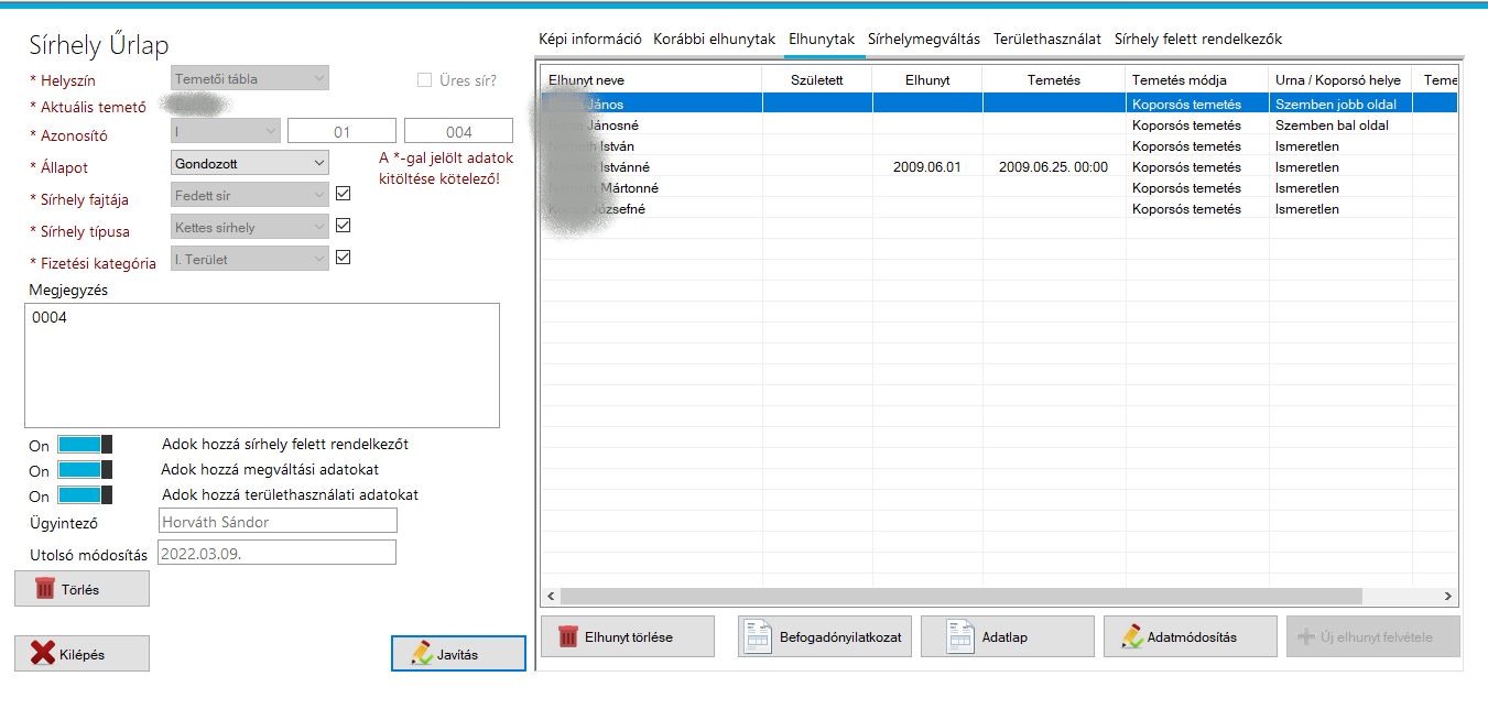 A kép bal oldalán található sírok közül válassza ki a módosítandó sírhelyet vagy kattintson a szűrési feltételekre