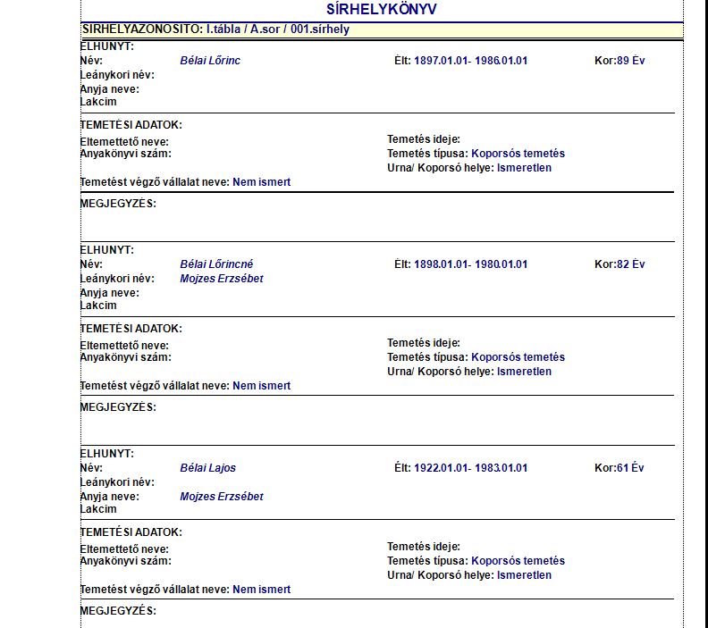 Ebben a menüpontban készítheti el a Sírboltkönyvet, mely megmutatja, hogy egy-egy sírban konkrétan kik vannak