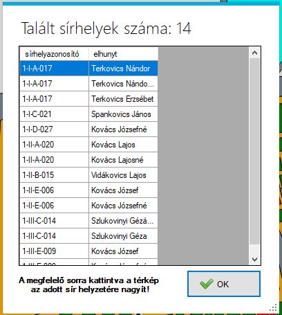 Kattintson a keresett névre az egérrel. A program a térképen középre húzza a kért sírt. Innentől ismét kattintson a