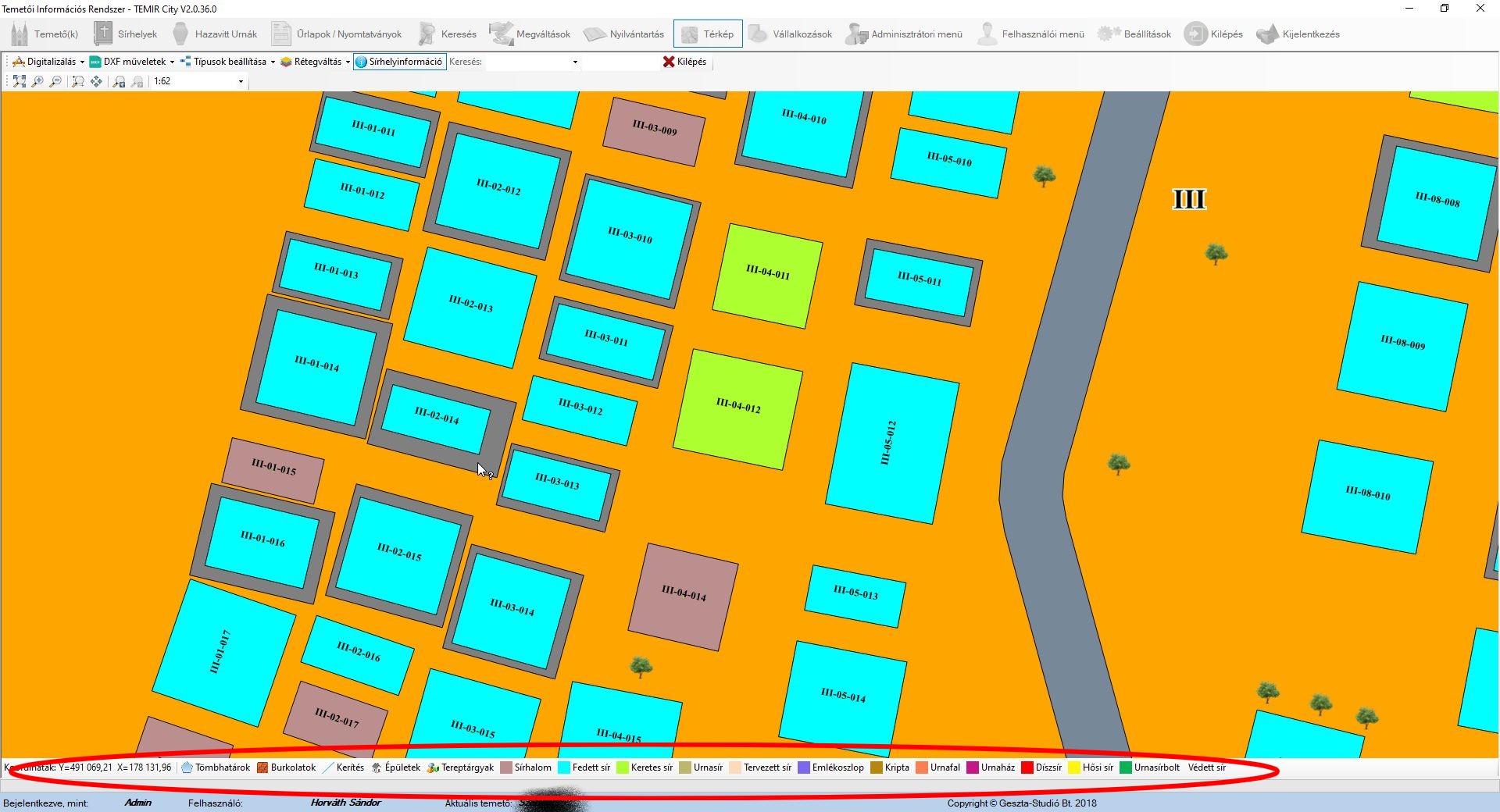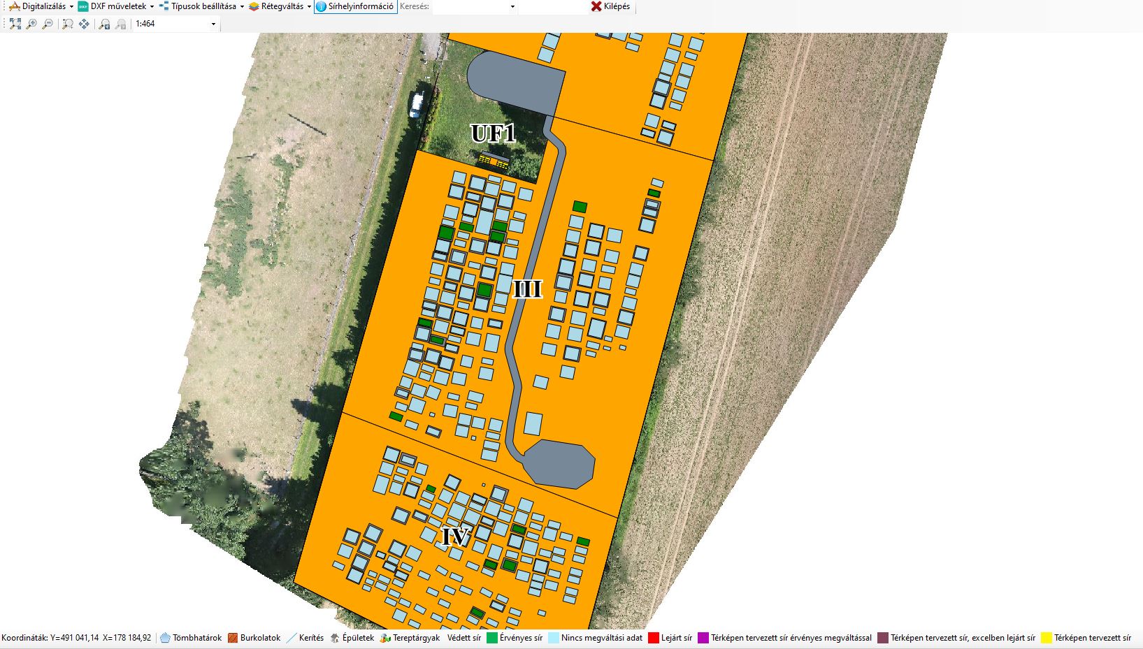 A térkép betöltéskor alapból a MEGVÁLTÁS SZERINTI RÉTEGEZÉS töltődik be, azonban Önnek lehetősége van átváltani a TÍPUS SZERINTI RÉTEGEZÉSre, továbbá amennyiben igényli betöltheti az aktuális temető ORTOFOTO (drónos légi fénykép) térképét is, de ezt kérje meg külön tőlünk az info@temir.hu mailen.